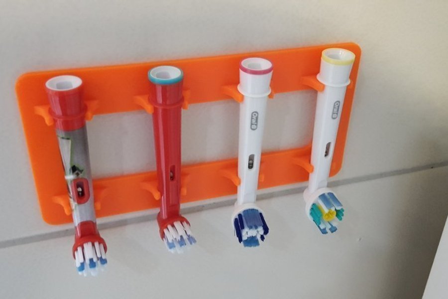 En stilren och praktisk hållare för Oral-B tandborsthuvuden, 3D-printad i PLA-plast. Den kommer i grå färg eftersom min orangea filament är slut för tillfället. Perfekt för att hålla upp till fyra borsthuvuden organiserade och hygieniskt separerade.