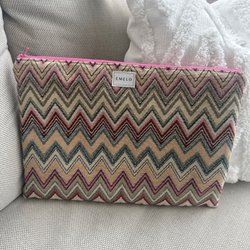 Necessär från EMELO med ett färgglatt zickzack mönster. Väskan har ett fack på insidan och ett handtag på sidan.