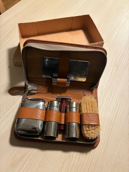 Klassisk rese necessär med tillbehör. Inkluderar borste, behållare och rakhyvel.