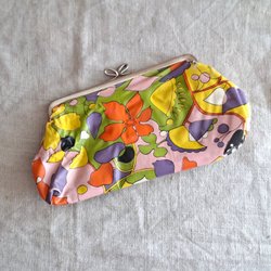 Retro sminkväska med orange och gult mönster. Insidan är målad i rosa och orange. Mått: Höjd ca 25 cm, bredd ca 30 cm.