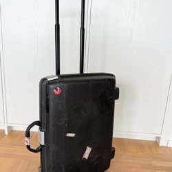 Svart resväska 65x 55 cm med hjul..Något sliten på utsidan