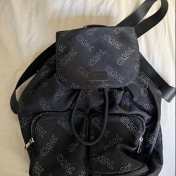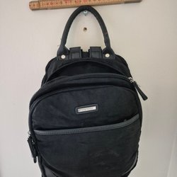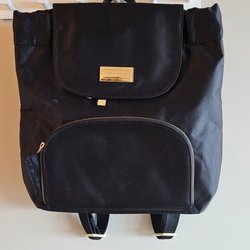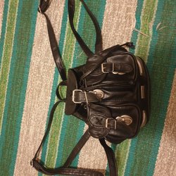 Svart skinnliknande ryggsäck 30×25 cm. Många fack både invändigt och utvändigt. Kan bäras som ryggsäck eller så drar man i remmen och bär den som axelväska.