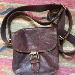 Grå väska med svart band och brunt läderhandtag. Grovt tyg, typ canvas, beige bomullsfoder. Materiallapp saknas. Kan bäras som ryggsäck eller över axeln.