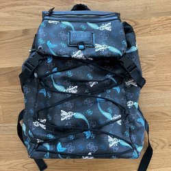 Blå ryggsäck med lock i krokodilmönster. Ryggsäcken har justerbara axelremmar och ett handtag upptill.