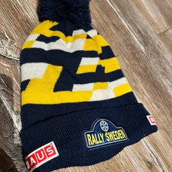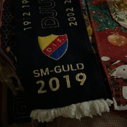 Blå stickad mössa med Djurgården Hockeys emblem och årtalet 1891.