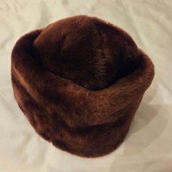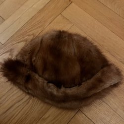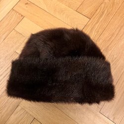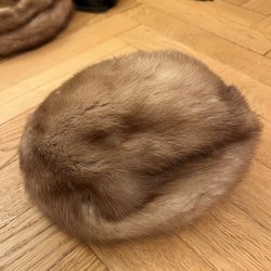 En pälsmössa. Perfekt för kalla dagar.Mink. Typ pillerburk. Använd någon enstaka gång I nyskick men gammal