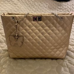 Vit stickad mössa med ett flätat mönster och små strasstenar. Mössan har en stor gråbrun tofs.
