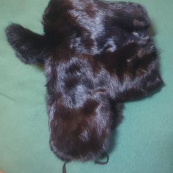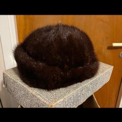 Brun pälsmössa med ett klassiskt utseende. Mössan har en rundad form och en mörkbrun färg. Rätt färg bild 1. Omkrets 57 cm. Längd ifrån kullen till kanten 17 cm. Tror att skinnet är bisam.