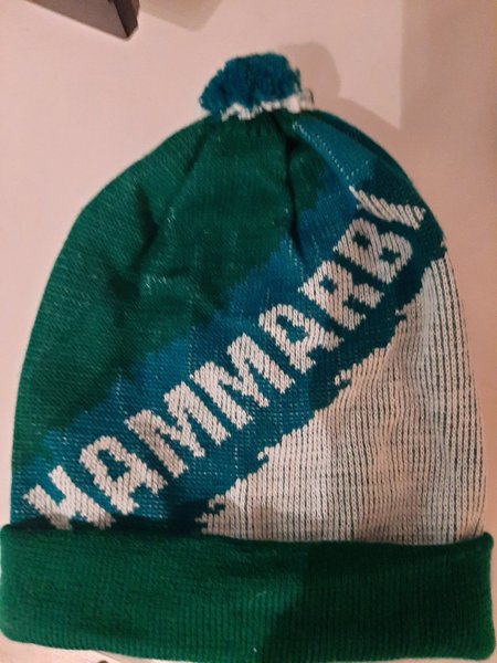 En grön och vit stickad mössa med texten "HAMMARBY" tryckt på sidan. Mössan har en grön kant nedtill och en liten boll på toppen.