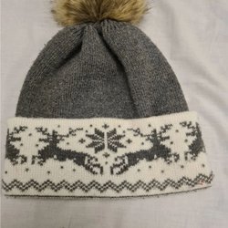 Gråmelerad stickad mössa med ribbstickad kant. Mössan har en liten etikett nedtill. För ungefärlig storlek se bilder.