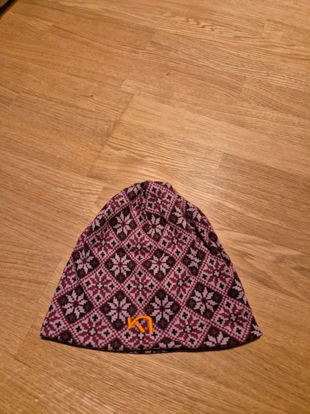 Beanie (mössa) med ett mönster i lila, svart och vinrött. Den har en orange logotyp (Kari traa). 100 % ull.