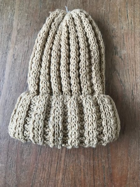 En stickad mössa i en ljusbrun nyans med ett ribbat mönster. Mössan har en uppvikt kant.