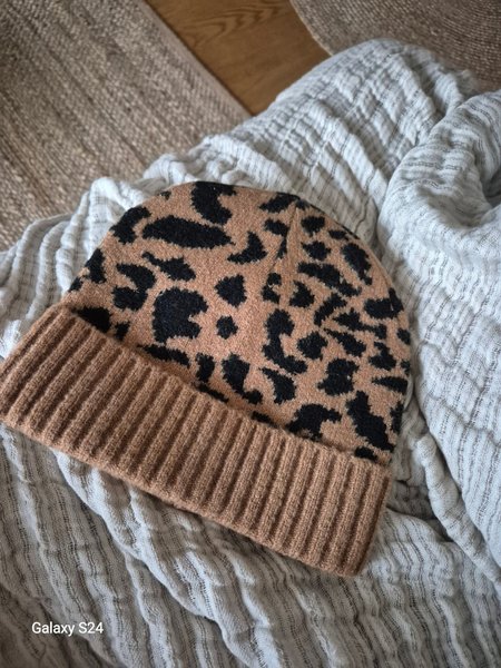 Brun stickad mössa med svart leopardmönster. Mössan har en ribbstickad kant.