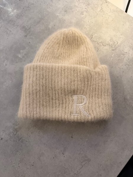 En beige stickad mössa med en broderad "R" på framsidan.