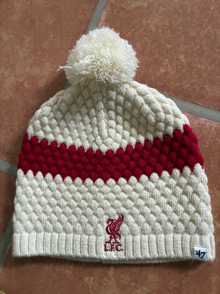Vit stickad mössa med röd rand och en vit tofs. Mössan har en broderad Liverpool FC logga framtill och en liten ’47 märkning på kanten.