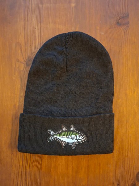 Svart mössa med en tryckt makrill på framsidan. Mössan har en klassisk design med en uppvikt kant. Aldrig använd.