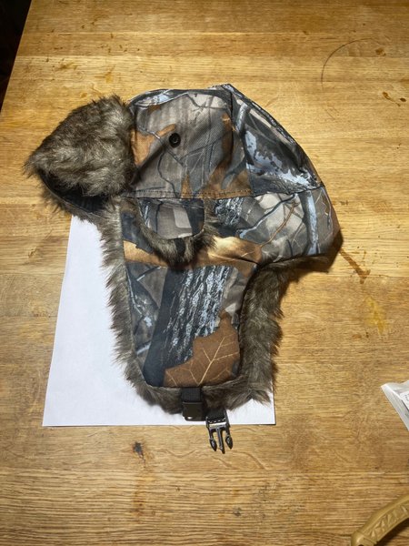 Vintermössa med öronlappar och justerbart spänne. Mössan har ett kamouflagemönster. Storlek M lite töjbar mycket varm. Helt ny