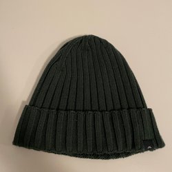 En stickad mössa i en mörkgrön nyans. Mössan har en ribbstickad kant som kan vikas upp och en mjuk, avsmalnande topp. Den är designad för att ge värme och komfort.