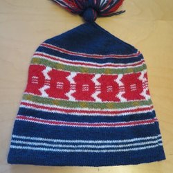 Stickad ullmössa med ett flerfärgat mönster i rött, vitt, grönt och blått. Mössan har en stor tofs upptill.