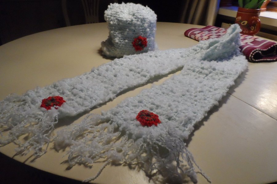 Set med mössa och halsduk i ljusblått med röda blomdetaljer. Mössan är en varm och mysig modell, och halsduken är lång med fransar i ändarna. Båda delarna har en mjuk och fluffig textur.
