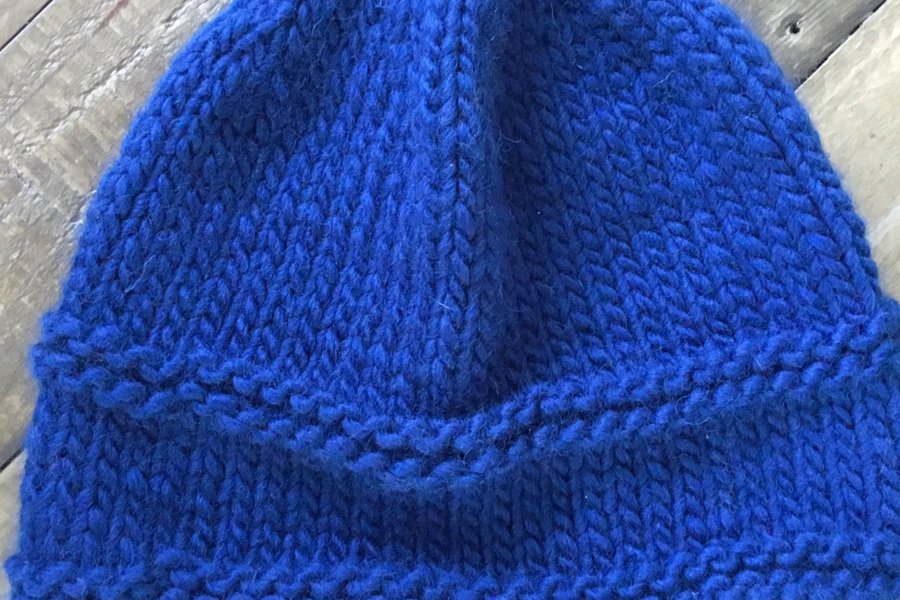 Blå stickad mössa med en bred kant.