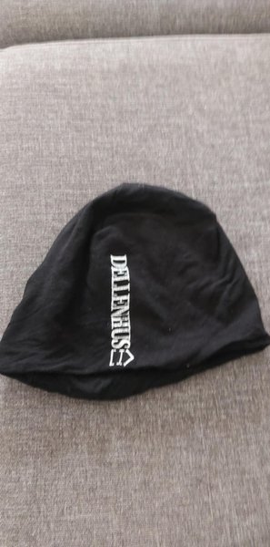 Svart mössa med texten "DELLENIUS" tryckt vertikalt på sidan.