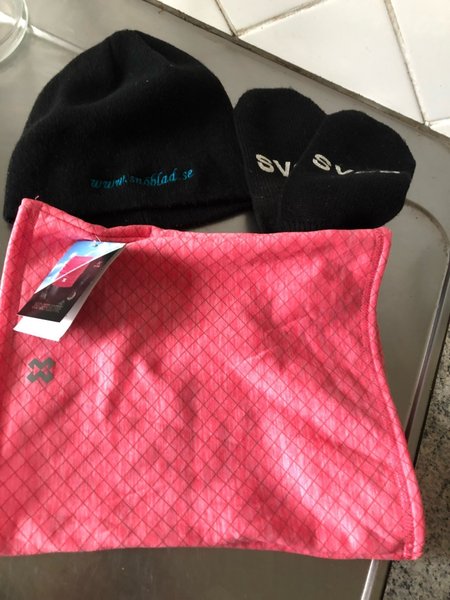 Här är ett set med en svart mössa med texten ”www.snoblad.se” broderad, ett par svarta vantar vita bokstäver ”SV” och en rosa halsskydd med ett mönster av rutor och en etikett.med reflexmönster