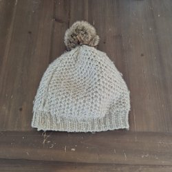 En stickad mössa i en ljus nyans med en stor, fluffig tofs upptill. Mössan har en klassisk design som passar de flesta stilar.