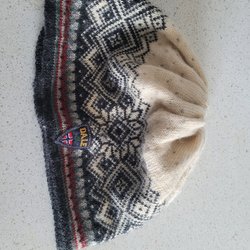 Stickad mössa med randigt mönster i färgerna svart, vit, gul, röd och grön, med svart pompom i toppen. Längd 57cm, bredd ca 25 cm