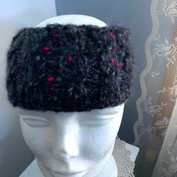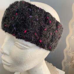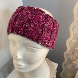 Pannband i flerfärgat rosa lila nyans garn med flätstickning.Höjd10cm