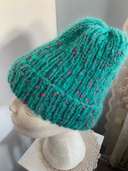 En stickad mössa i mohairblandad garn i turkos färg med insprängda prickar i rosa och lila nyanser. Längd30cm.