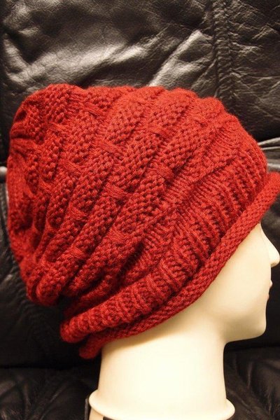 En röd stickad mössa med ett intressant mönster. Mössan har en avslappnad passform och en nedvikt kant.