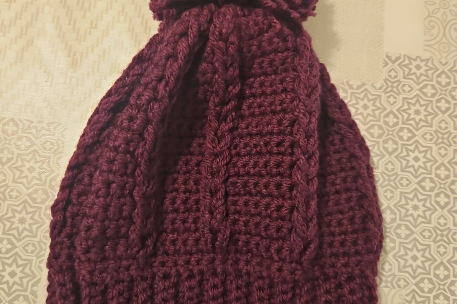 handgjord stickade Mössa med tofs i en mörkare nyans av lila. Mössan har ett flätat mönster och en ribbad kant nedtill.