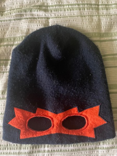 Mörkblå mössa med ett orange maskliknande motiv framtill. Masken har två ovala utskärningar för ögonen och en taggig kant runt om.
