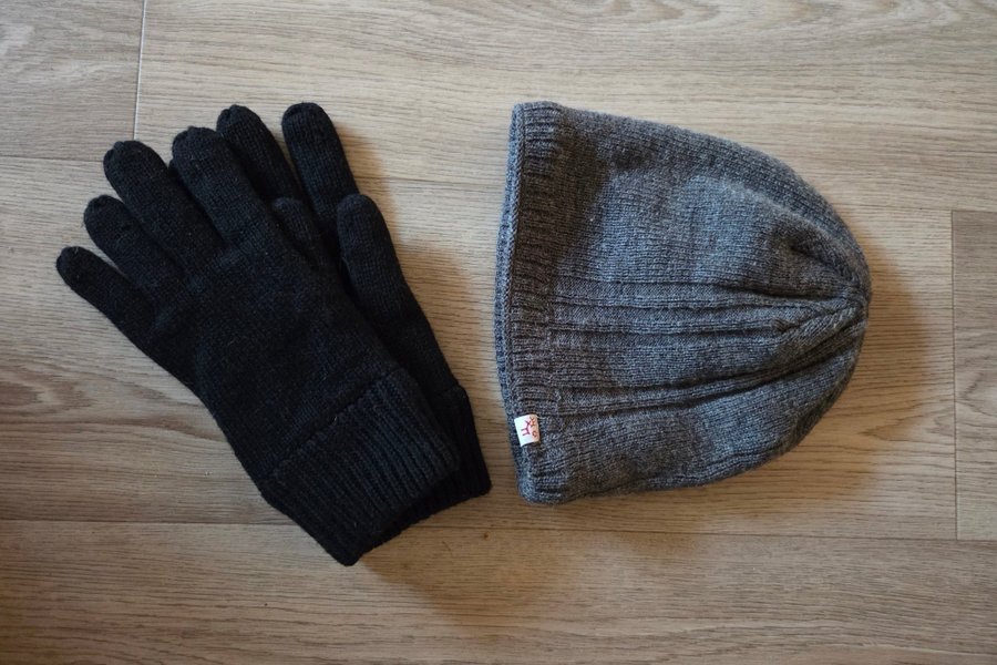 Ett set med en grå stickad mössa och ett par svarta handskar.Båda fleecefodrade.Knappt använda.