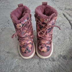 Stickad mössa i mörkblått, ljusblått och vitt med ett mönster av snöflingor. Mössan har flätade band. Fleece fodrad.