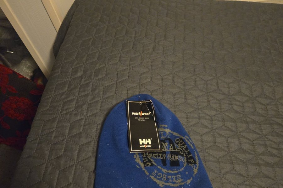 En blå mössa med tryck från Helly Hansen Workwear. Mössan har fortfarande prislappen kvar.