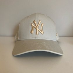 En ljusbrun keps med en broderad bokstav på framsidan. Kepsen har lufthål och en böjd skärm. 60cm ny keps