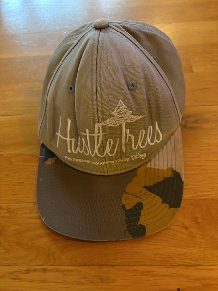 En gråbeige keps med texten "Hustle Trees" broderad på framsidan. Kepsen har en skärm med ett kamouflagemönster i beige och brunt. Storleken kan justeras baktill. Tvättad.