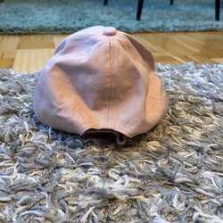 Rosa keps med texten ”CATEN BAND” broderat på framsidan. Kepsen har en justerbar rem baktill för att passa olika huvudstorlekar. Dekorativa vita färgstänk finns på skärmen.