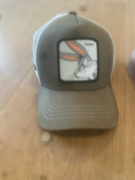 En grå keps med ett tryck av Bugs Bunny på framsidan. Kepsen har ett nät på baksidan.