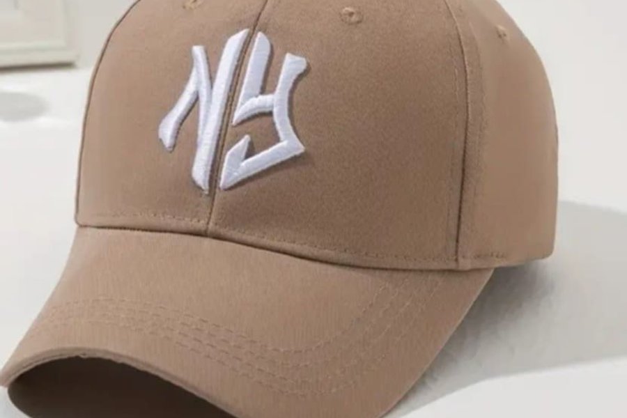 En beige keps med en vit "NY" logotyp broderad på framsidan. Kepsen har en böjd skärm och en justerbar rem baktill för att passa olika huvudstorlekar.