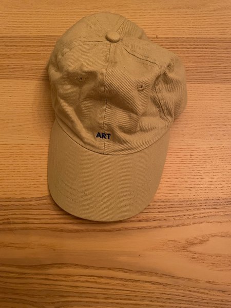 En keps i beige färg med texten "ART" broderad i blått på framsidan. Kepsen har en klassisk design med en böjd skärm och justerbar passform.