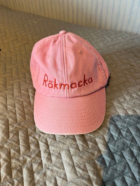 Rosa keps med texten "Räkmacka" broderad i rött på framsidan. Kepsen har en justerbar rem baktill för passform.