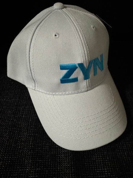 Vit keps med blå brodyr av texten ”ZYN” på framsidan. Klassisk modell med skärm och justerbar passform.