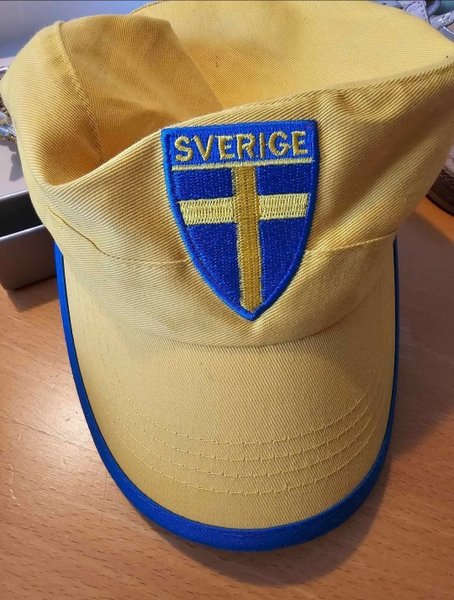 Gul keps med blå kant och en broderad Sverigelogga framtill. Loggan är i form av en sköld med texten "SVERIGE" överst och en gul korsflagga på blå bakgrund.