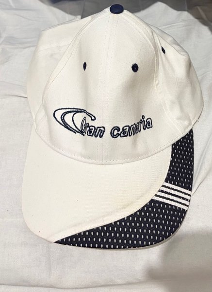 Vit keps med texten "Gran Canaria" broderad i mörkblått på framsidan. Skärmen har ett mörkblått mönster med vita prickar och vita ränder.