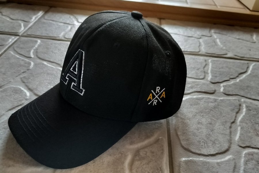 Svart keps med en stor vit bokstav "A" broderad på framsidan. På sidan finns en mindre broderad logotyp med bokstäverna "A" och "R" i gult och vitt, arrangerade i en kvadratisk form. Kepsen har en klassisk design med en böjd skärm och synliga sömmar.