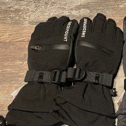 Ett par svarta handskar med justerbart spänne runt handleden. Handskarna har vita detaljer och texten "SPORTKR" i rött.