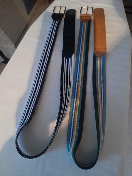 Här är ett set med två elastiska bälten med ränder och ett svart bälte. Bältena har spännen i metall.
